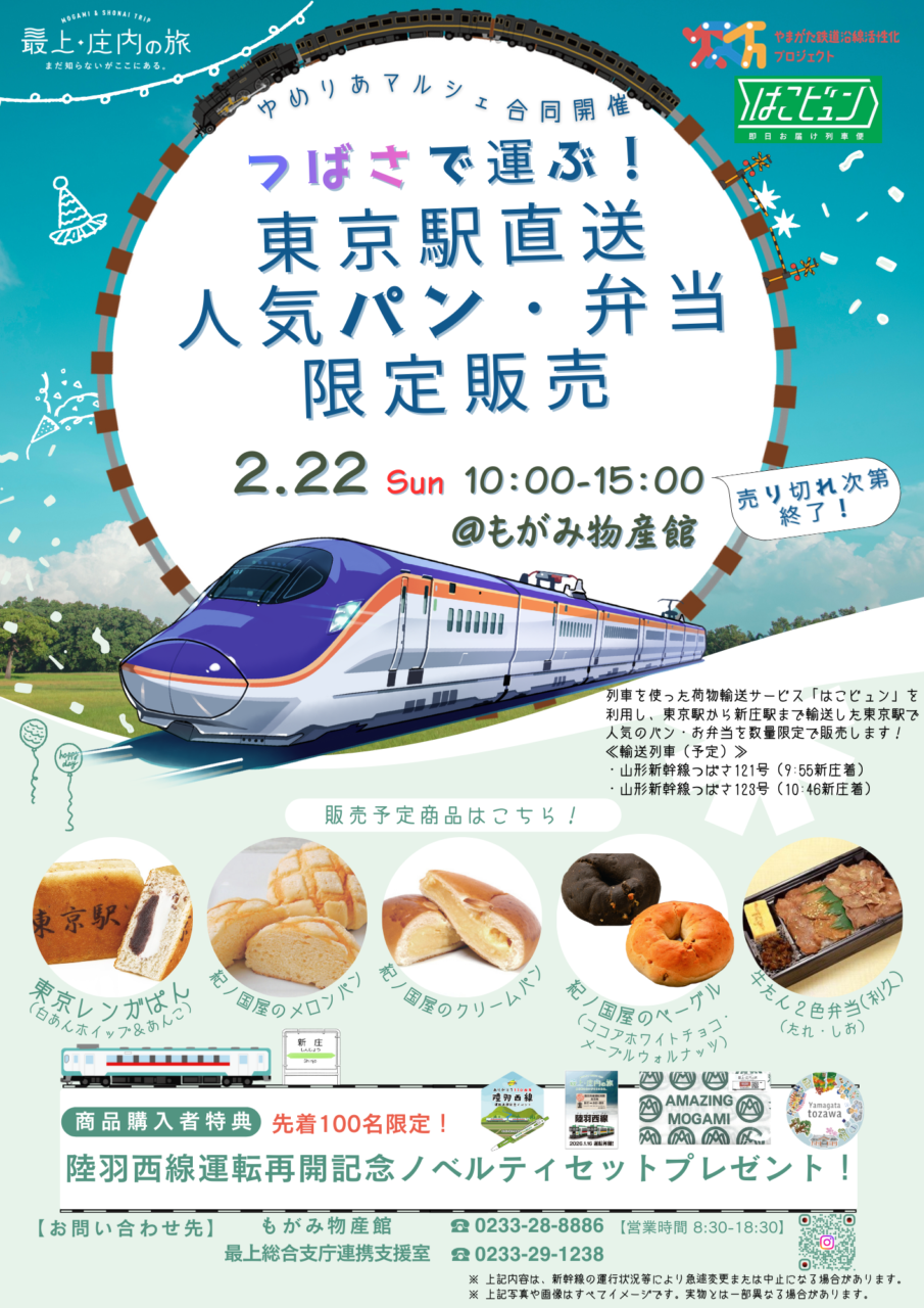 2月22日(日)に、山形新幹線「つばさ」を利用して新庄駅まで輸送した東京駅の人気商品を、『もがみ物産館』で限定販売されます!